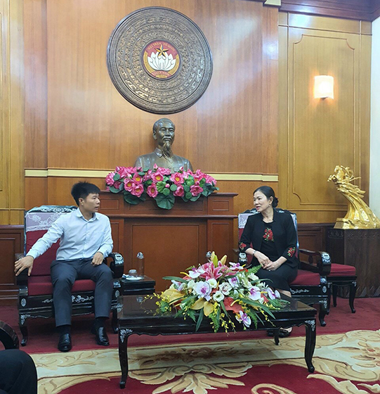 Ông Đinh Công Chính, thành viên Hội đồng quản trị C BHI nói chuyện với Phó Chủ tịch Ủy ban Trung ương Mặt trận Tổ quốc Việt Nam, Trương Thị Ngọc Ánh